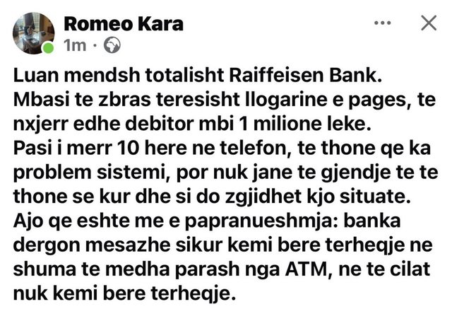 “Luan mendsh totalisht Raiffeisen Bank. Mbasi të zbras tërësisht llogarinë e pagës, të nxjerr edhe debitor mbi 1 milion lekë,” shprehet ai në reagimin e tij.