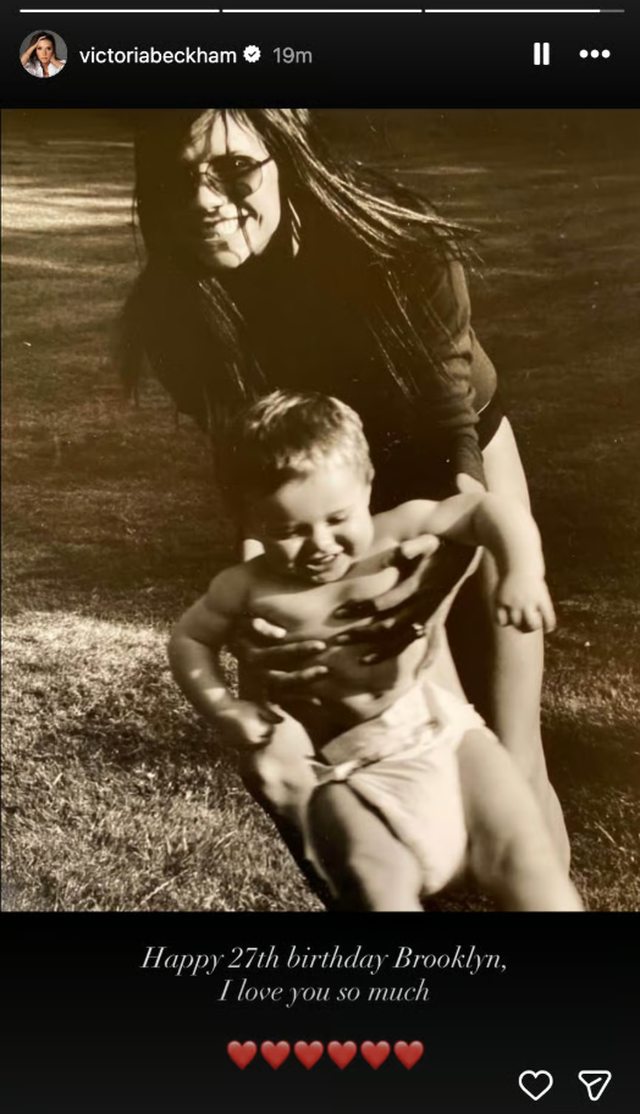 Victoria Beckham ndau të njëjtën fotografi në Instagram Stories, duke shkruar: “Gëzuar ditëlindjen Brooklyn, të duam shumë,” me një zemër të kuqe. Në një postim tjetër, ajo publikoi një fotografi bardh e zi ku mban Brooklyn-in si foshnjë, duke shtuar: “Gëzuar 27-vjetorin Brooklyn. Të dua shumë,” së bashku me disa zemra.