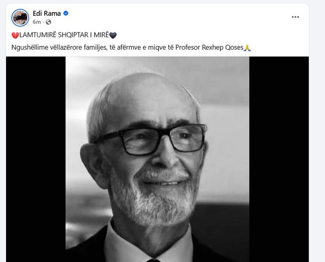 “LAMTUMIRË SHQIPTAR I MIRË! Ngushëllime vëllazërore familjes, të afërmve e miqve të Profesor Rexhep Qoses”, shkruan Edi Rama.