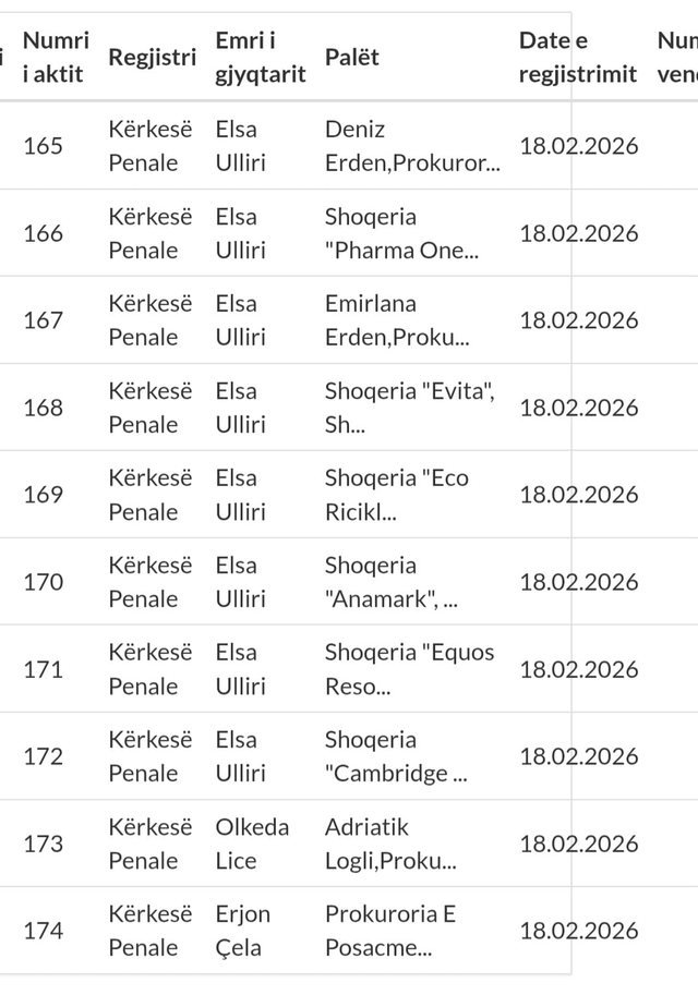 Sipas të dhënave zyrtare të regjistrit gjyqësor të siguruara ekskluzivisht për JOQ, më 18 shkurt 2026 janë regjistruar një seri kërkesash penale që përfshijnë disa shoqëri tregtare të oligarkut Klodian Allajbeu.