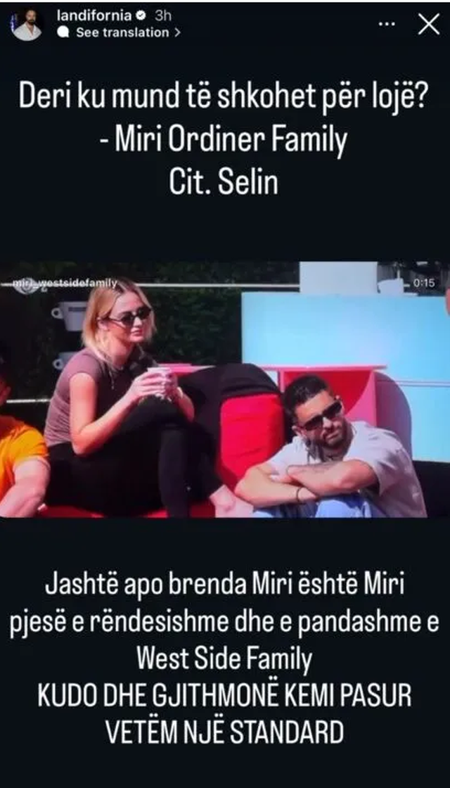 “Deri ku mund të shkohet për lojë? Jashtë apo brenda Miri është Miri, pjesë e rëndësishme dhe e pandashme e West Side Family,” – ka shkruar Landi.